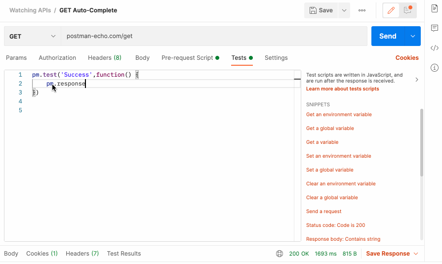Postman will prompt you with suggestions as you enter text. Select one to autocomplete your code.