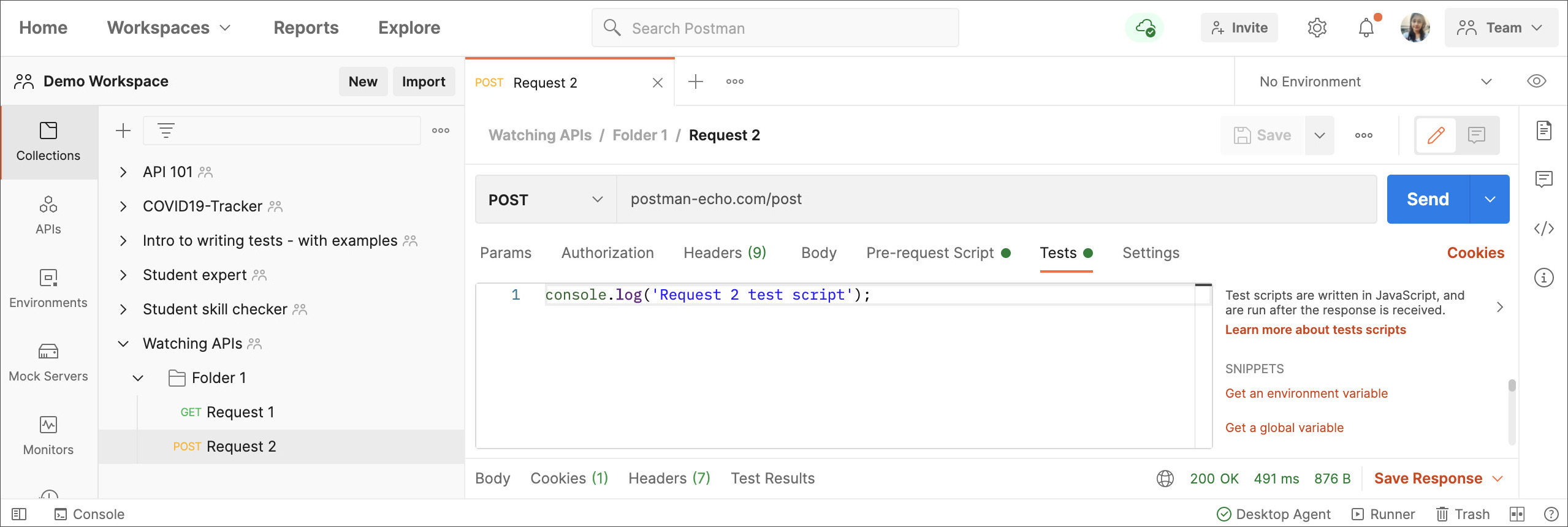 Postman contains a powerful runtime based on Node.js that allows you to add dynamic behavior to requests and collections. This allows you to write API tests, build requests that can contain dynamic parameters, pass data between requests, and a lot more. You can add JavaScript code to execute during 2 events in the flow: