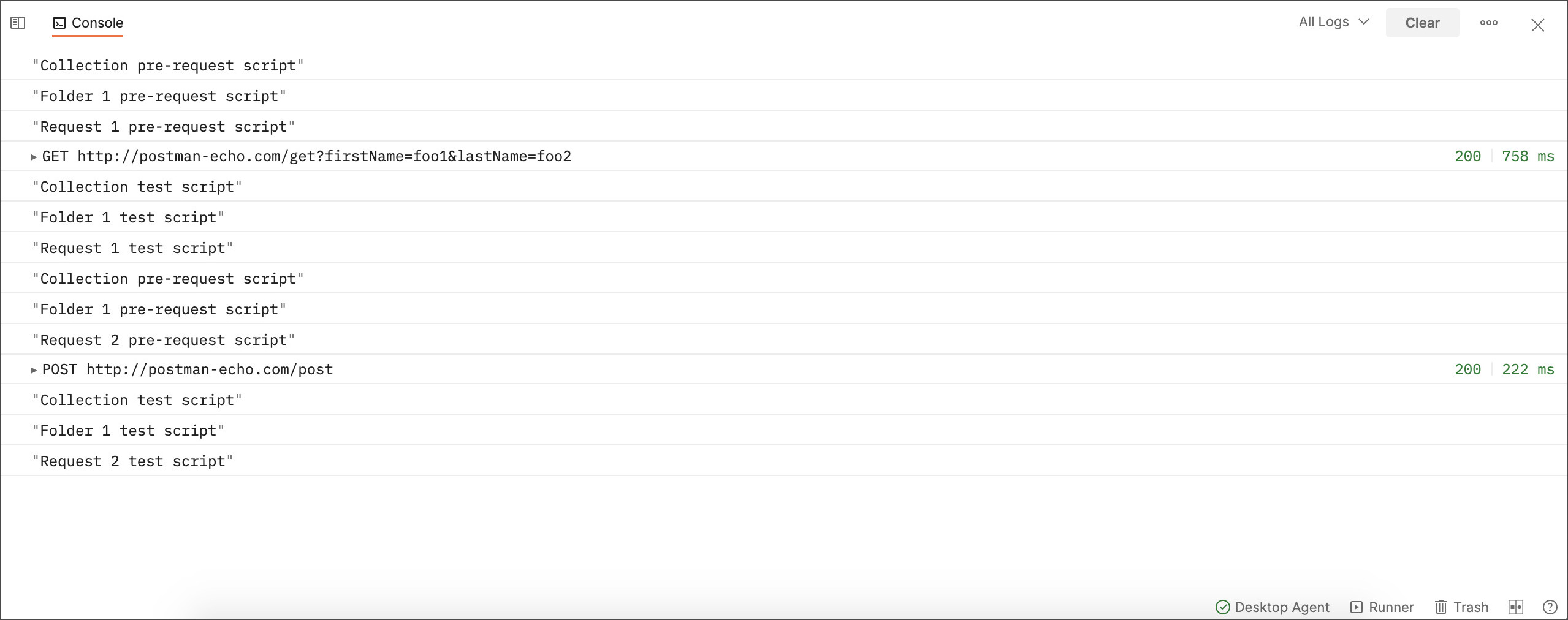 For every request in a collection, the scripts will always run according to the following hierarchy: collection-level script (if any), folder-level script (if any), request-level script (if any). Note that this order of execution applies to both pre-request and test scripts.